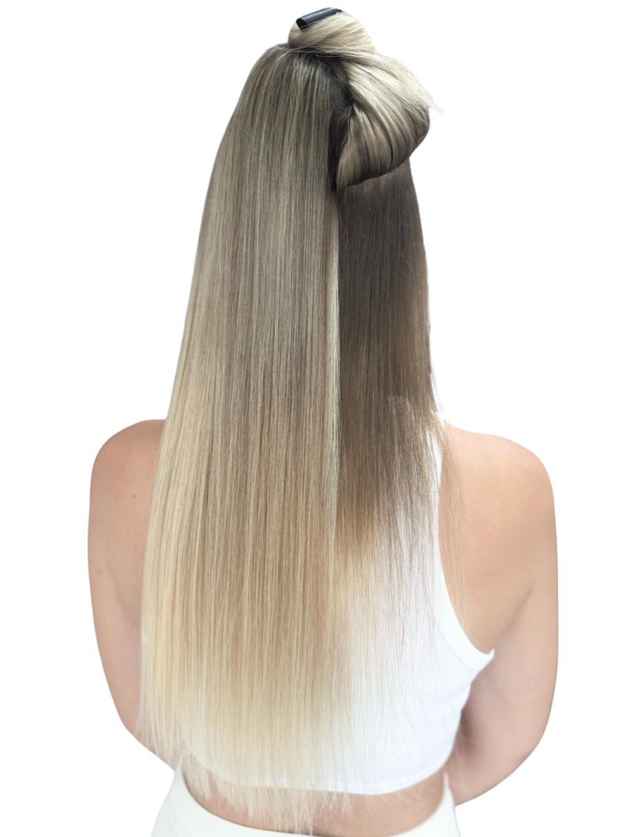 Unser neuestes System ist das Einnähen von Tressen - und was sollen wir sagen, wir sind begeistert. Hierbei handelt es sich um Haartressen, die einmal um deinen kompletten Kopf herum eingesetzt werden. Dadurch, dass keine einzelnen Strähnen oder Tapes eingesetzt werden, erhältst du einen maximal natürlichen Look. Das Einarbeiten geht im Vergleich zu Bondings unheimlich schnell und du bekommst innerhalb kürzester Zeit einen Wow-Effekt. Je nach Haarwachstum hält eine solche Haarverlängerung oder Verdichtung 6-8 Wochen. Aber auch hier können die Tressen wiederverwendet und hochgesetzt werden. Je nach Pflege deiner Haare hast du bis zu 1 Jahr etwas von deinen Tressen.