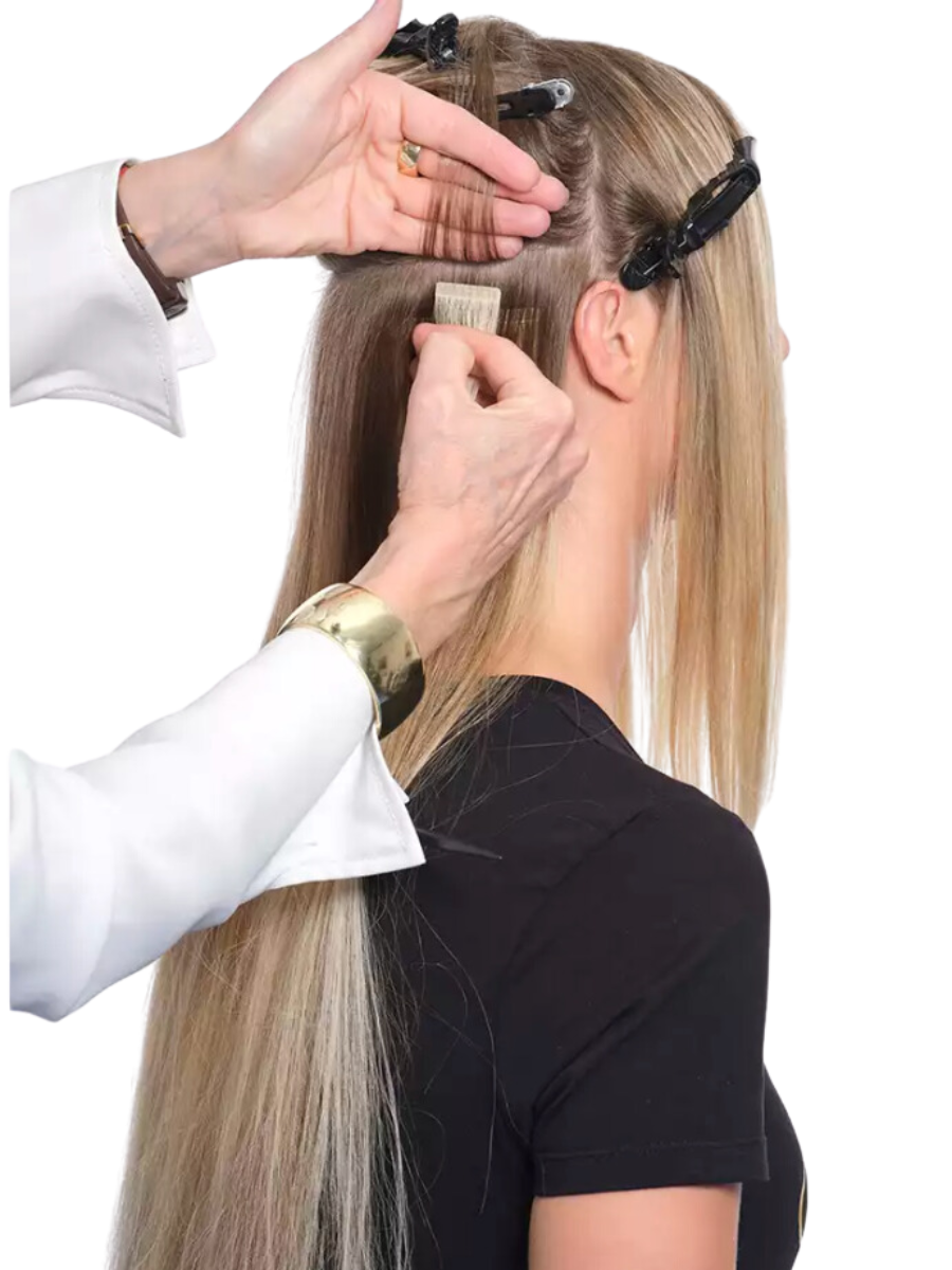 Bei Tapes handelt es sich um Haartressen mit einer Breite von 3-4 cm, die mit doppelseitigem Klebeband (natürlich speziell für Tapes, nicht das aus dem Handel ;-)) ins Haar eingesetzt werden. Um dein Eigenhaar zu ummanteln wird immer ein Tape von unten und eins von oben eingesetzt - deine Haare liegen quasi wie in einem Sandwich zwischen zwei Tapes. Je nach Haarwachstum hält eine solche Haarverlängerung oder Verdichtung 6-8 Wochen. Anschließend können die Tapes aber wiederverwendet und wieder hochgesetzt werden. Je nach Pflege deiner Haare ist dieser Vorgang bis zu 3 Mal möglich.