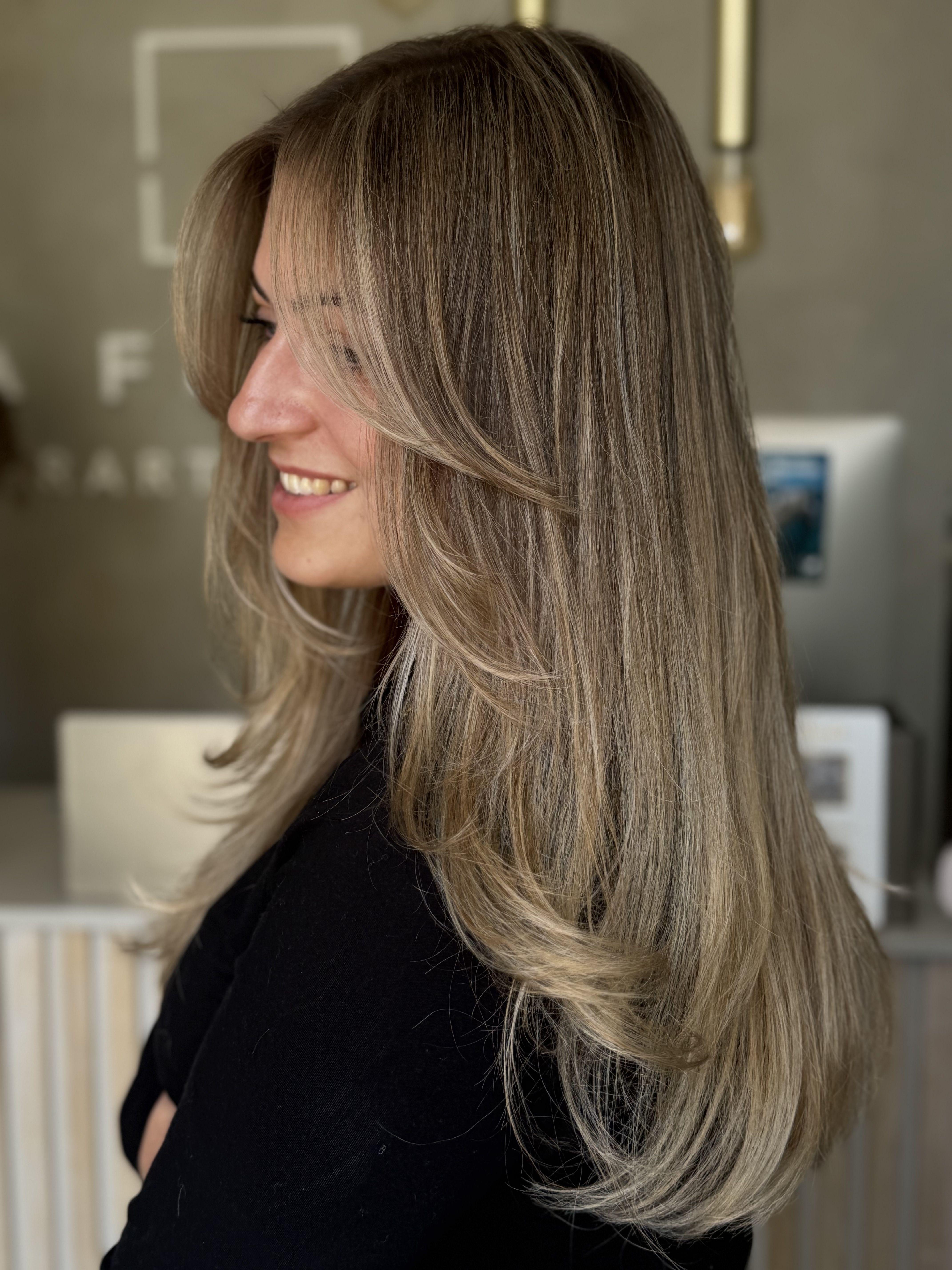 Unsere Signature-Balayage für eine mittlere Aufhellung. Sichtbar mehr Dimension, lebendige Farbreflexe und ein moderner Glow, der deine Gesichtszüge perfekt unterstreicht.